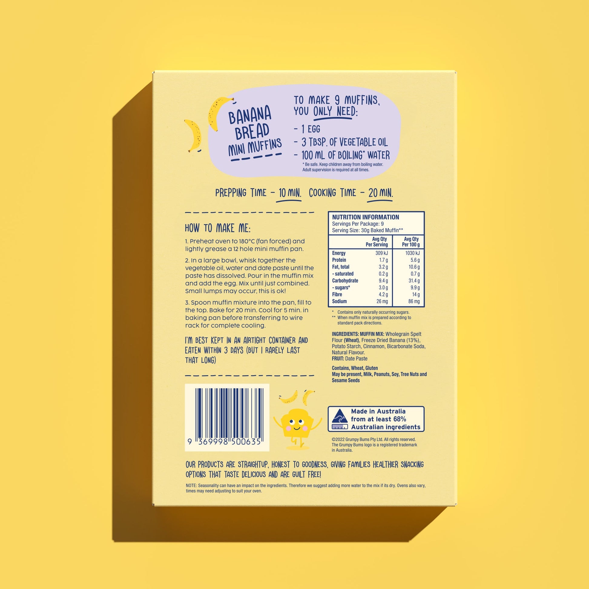 MUFFIN MIX: Wholegrain Spelt Flour (Wheat), Freeze Dried Banana (13%), Potato Starch, Cinnamon, Bicarbonate Soda, Natural Flavour